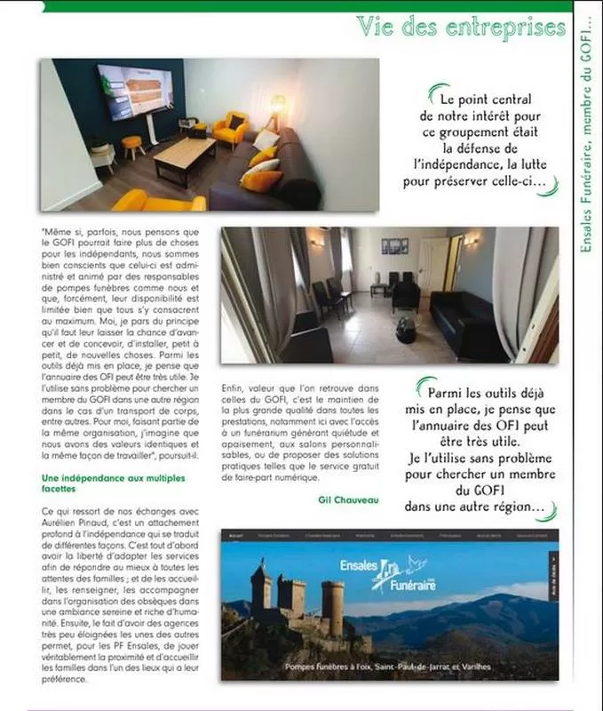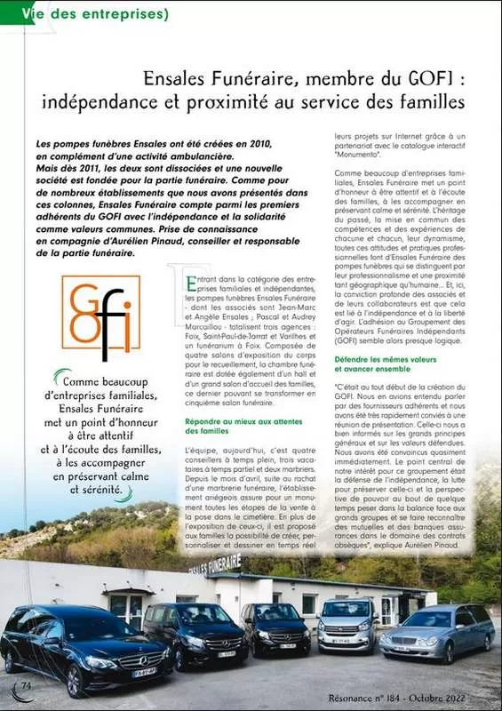 Les pompes funèbres Ensales ont été créées en Ariège à Saint-Paul-de-Jarrat en 2010... Vous retrouverez le récit et l'évolution de notre entreprise funéraire, adhérente au GOFI. Comme beaucoup d'autres entreprises funéraires, le magazine Résonance relate une partie d'échange avec Aurélien Pinaud, conseiller funéraire pour Ensales Funéraire, dont les quatres associés sont Jean-Marc et Angèle Ensales, Pascal et Audrey Marcaillou.